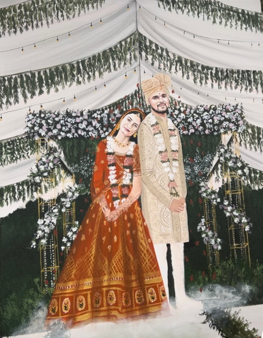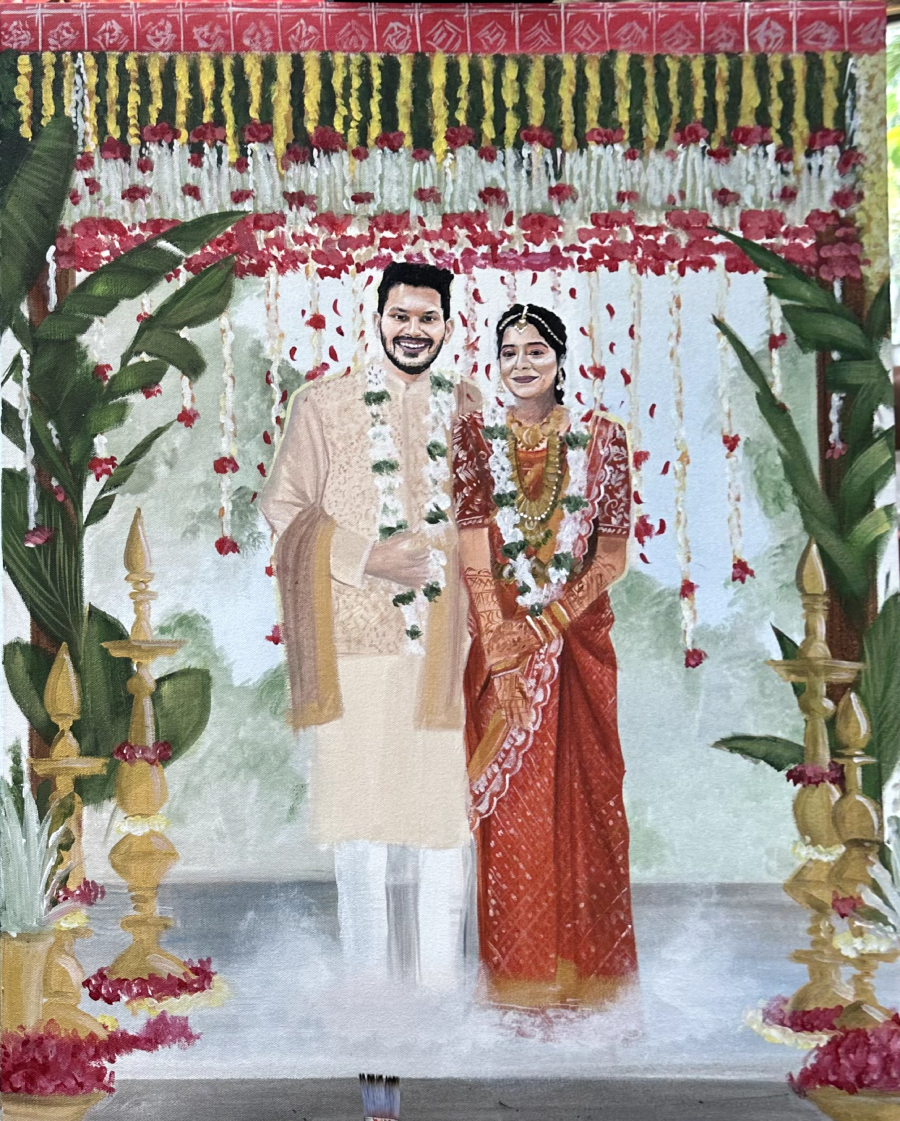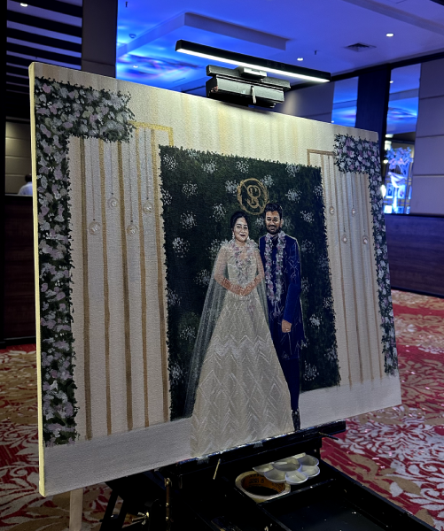 Having an artist painting live at the wedding adds an interactive and entertaining element for guests. They can watch the artwork come to life throughout the event, which can be a memorable and engaging experience. It provides a unique perspective that photographs often can't fully convey.